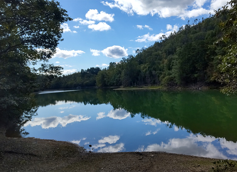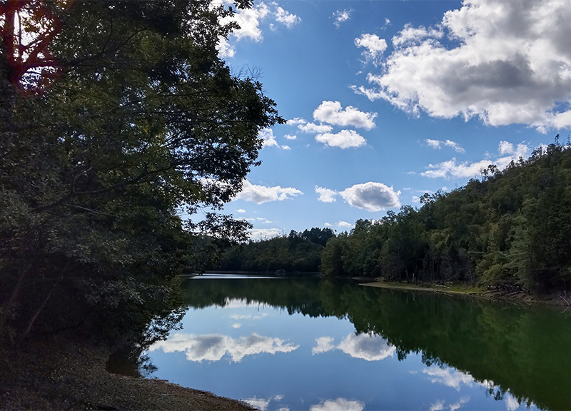 快晴のハイキング日和に出会ったも見事な水鏡。この感動を「空澄みて、雲浮かぶ池、空ふたつ」と一句作ってみました。 京都トレイル北山西部の道沿いの池(江戸時代末期につくられたとのこと)ですが、湖のように自然に溶け込んでいます。